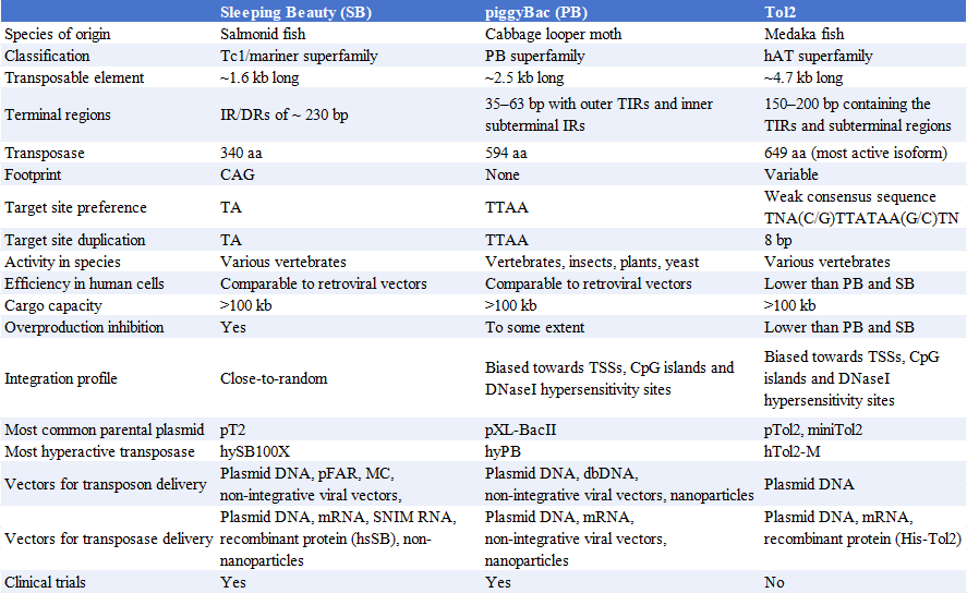 Three common transposon systems suitable for use as research tools are Sleeping Beauty, PiggyBac, and Tol2.